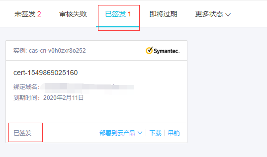 点击验证之后会自动添加一条域名解析记录,然后点击下面的提交审核。- 审核完成之后会提示为已签发